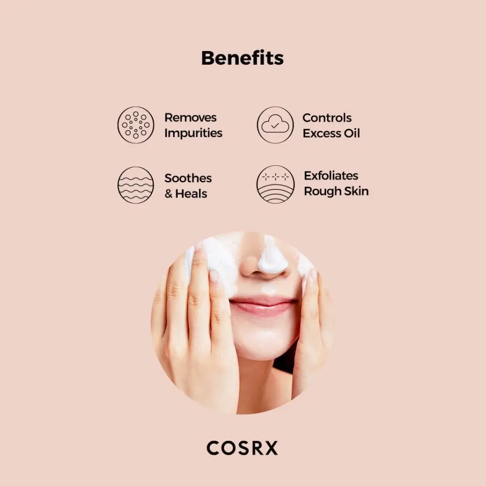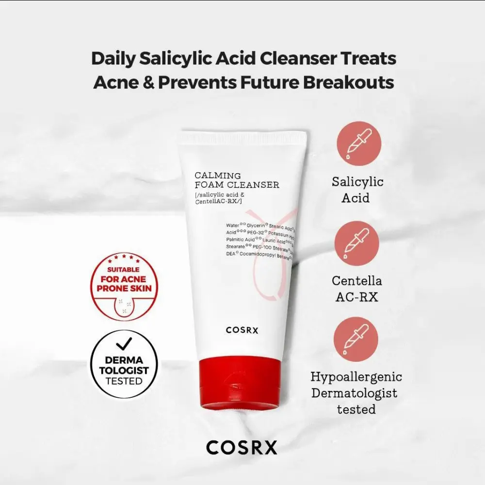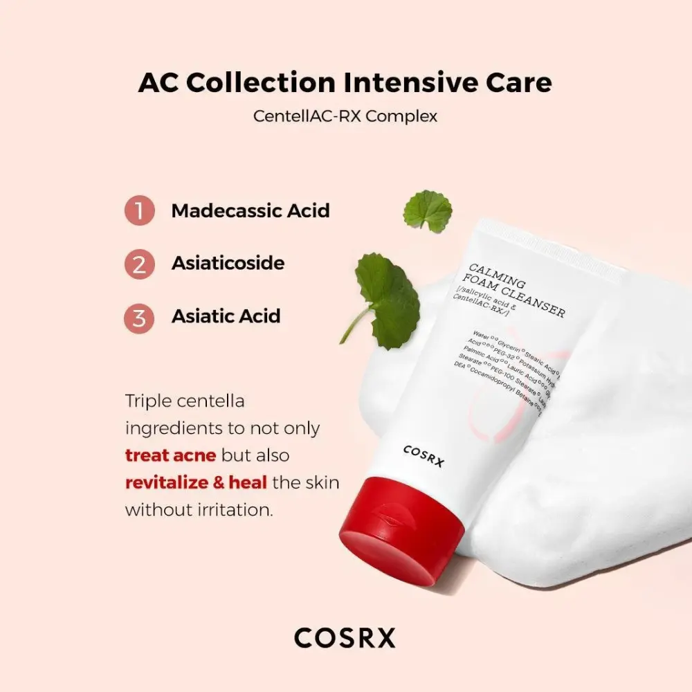 Cosrx Ac Collection Calming Foam Cleanser is a gentle cleansing foam for acne-prone skin. It’s formulated with salicylic acid, a type of beta hydroxy acid, to unclog pores, remove dead skin cells, and reduce the appearance of acne. The foam cleanser also contains Centella Asiatica extract, which helps soothe and calm irritated skin, and tea tree oil, which has antimicrobial properties to help fight acne-causing bacteria.The Cosrx Ac Collection Calming Foam Cleanser is free from parabens, sulfates, and artificial fragrances, making it suitable for sensitive skin. It has a light, foamy texture that spreads easily and rinses of cleanly.
